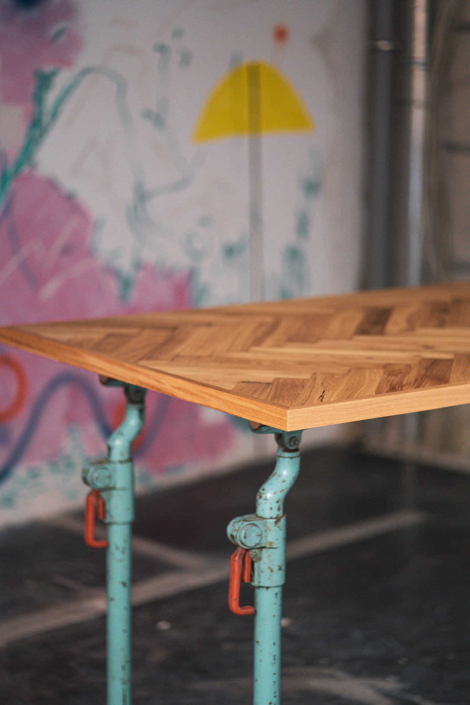 240 x 100cm im klassischen Fischgräten-Muster. Bei dem Gestell handelt es sich um einen Parallelbarren, der bis 2022 der Feuerwehr Frankfurt als Turngerät für die Sportprüfungen gedient hat. Auf Grund der Höhe des Barrens eignet sich diese Theke perfekt als Empfangstheke oder Kochinsel.